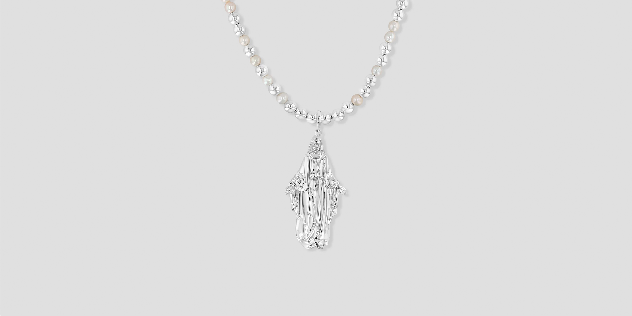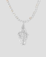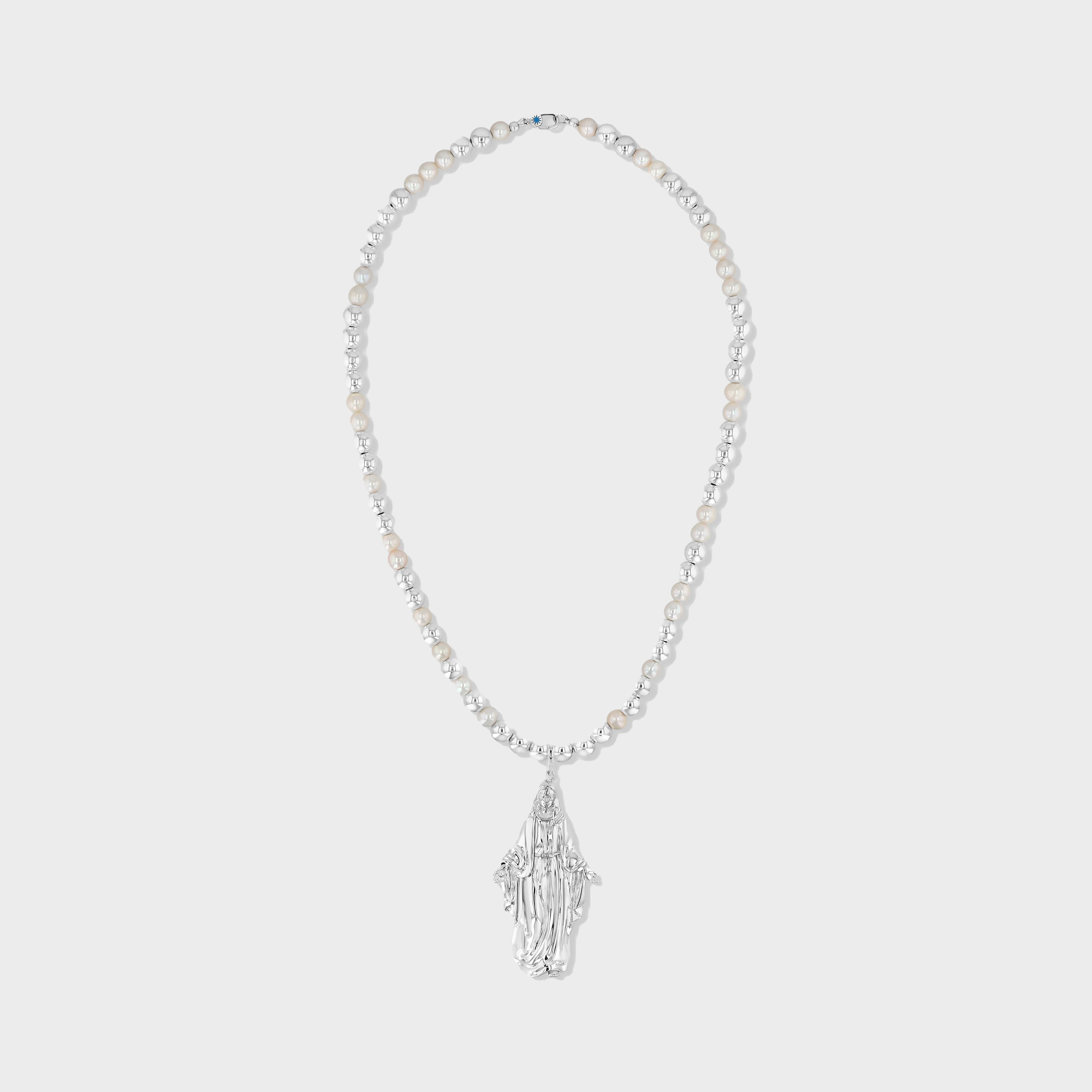 Premier natural white freshwater pearls, nearly perfect in 9mm round form, meet sculptural refinement combined with sterling silver accents. Each pearl is hand-selected for luminous symmetry, accented with sterling silver details, and anchored by a prominent figure of the Blessed Mother Mary.